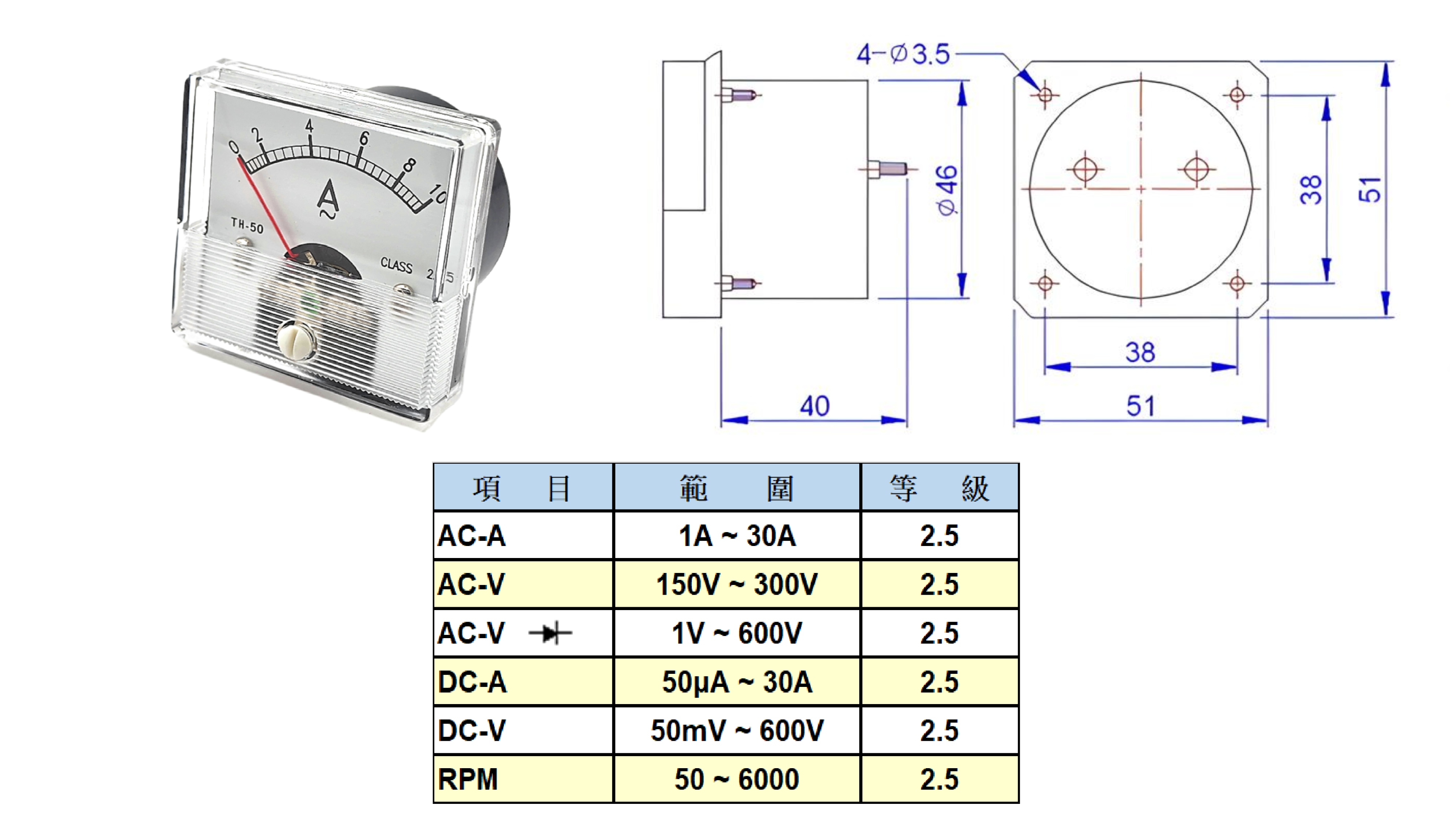 - Moving Coil Type: 50 µA – 10 A DC / 3 V – 1000 V DC