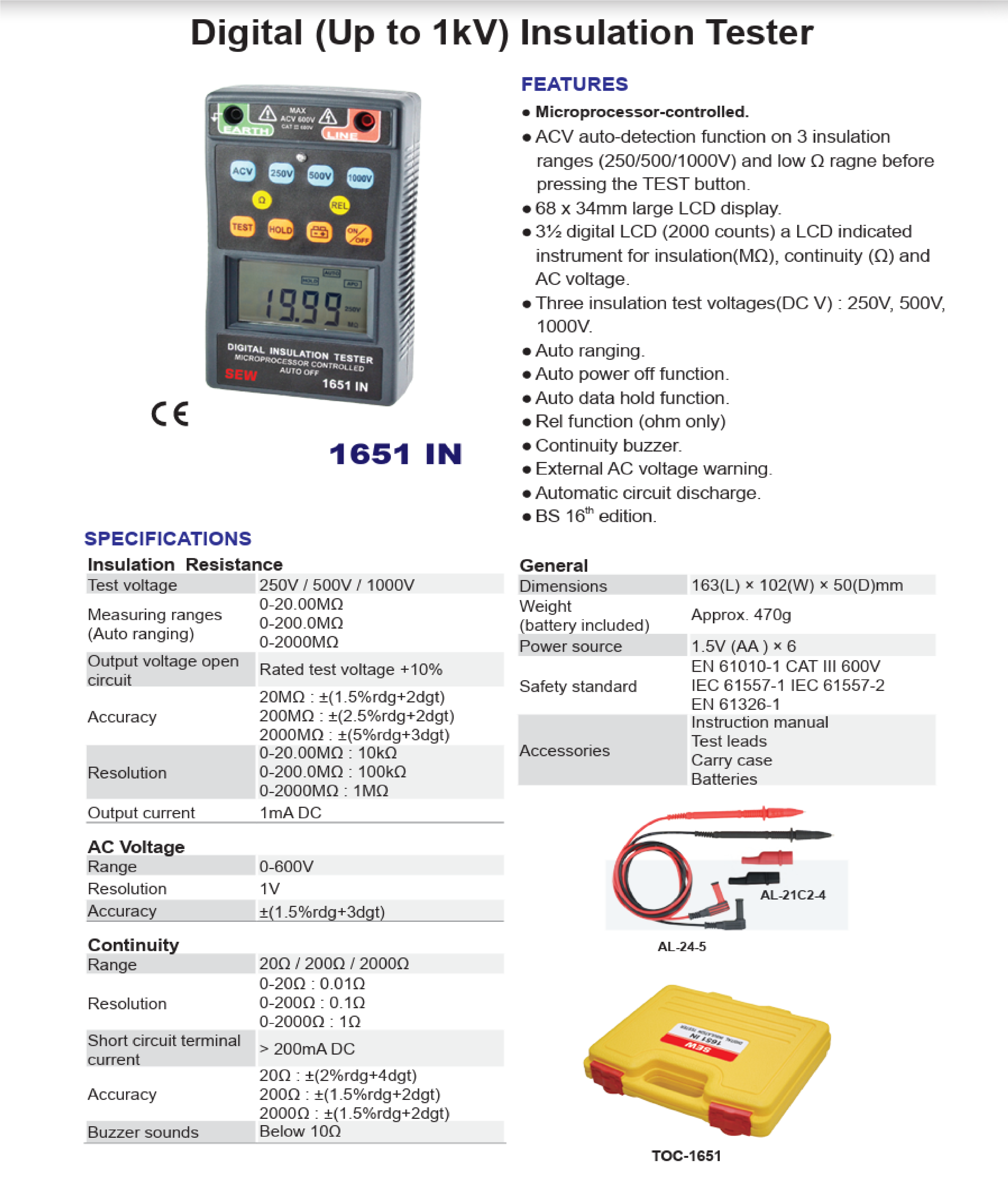 •3½ digital LCD (2000 counts) a LCD indicated instrument for insulation(MΩ), continuity (Ω) and AC voltage.